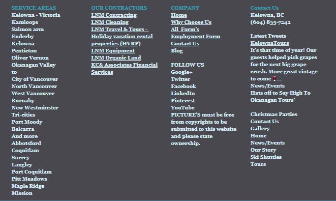 All Departments: LNM Contracting/ Shop Direct / Contact US / LNM Cleaning & LNM Travel / Say Hi to Okanagan Tours / Altimate Club Wine Tour / Red and White Wine Tours / Holiday Vacation Rental Properties & KC & Associate Financial Services.