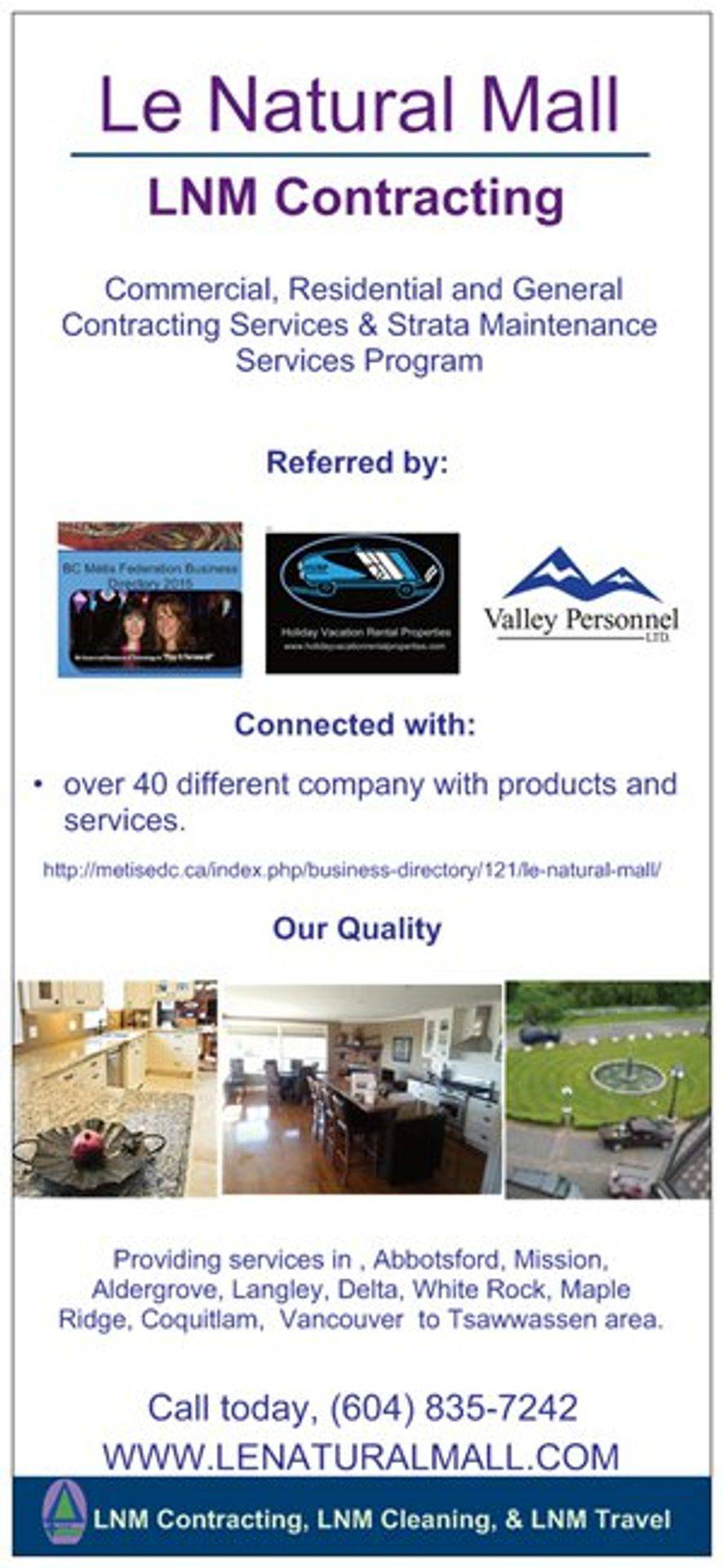 Former Brochures are not applicable / current these represented past administration / owners of Le Natural Mall. Our new brochures are under review and will be under the name of LNM Contracting. Not Le Natural Mall for it is closed! but this website has a few documents owned by LNM Contracting and for that reason this website is still up with the name of LNM Contracting at the domain of the former Le Natural Mall. Until our new website is built.